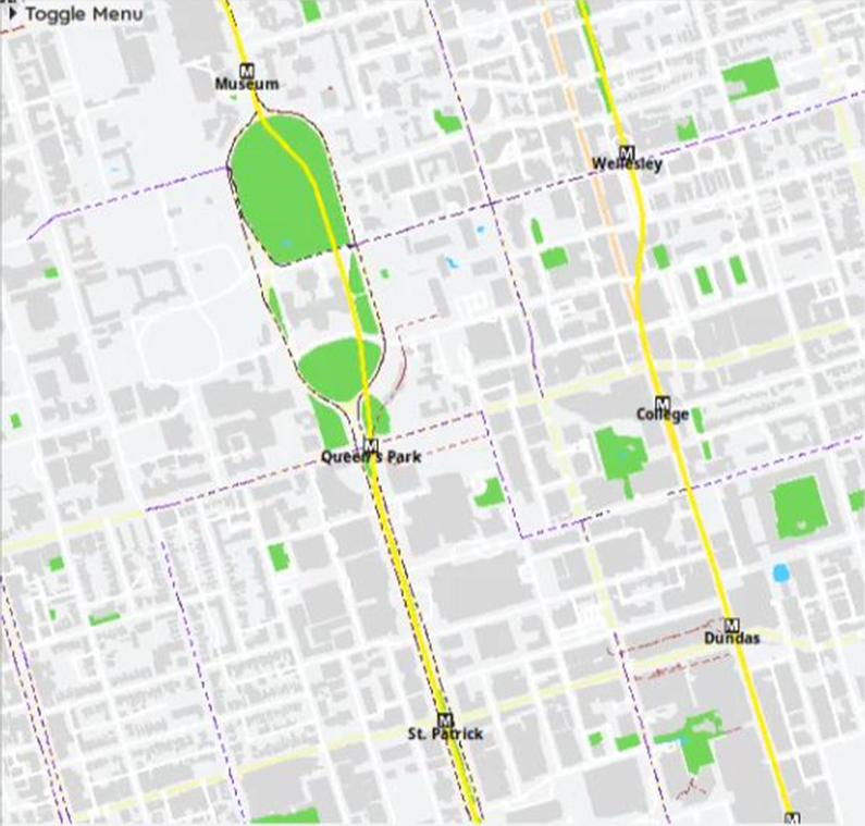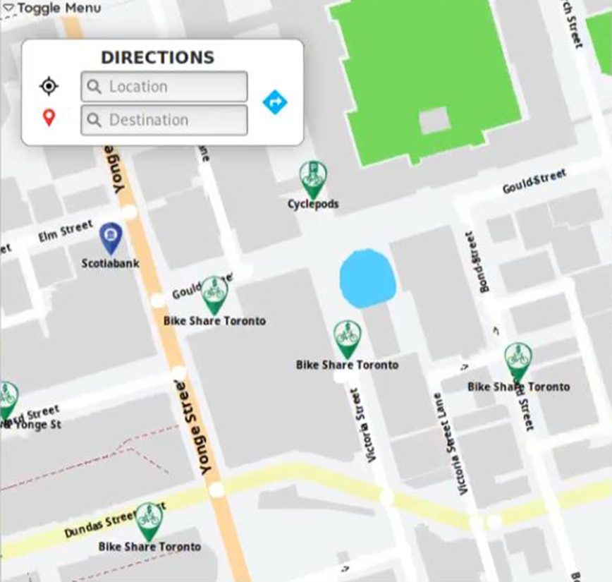A graphical mapping application that allows users to navigate their city via roads, paths, and subway, show points of interest (such as restaurants, banks, shops, etc.), and search for directions from point A to point B. With emphasis towards cyclists, this map also shows bike lanes/bike paths, including type of bike lane (such as whether or not there is a barriered bike lane), custom points of interest (such as bicycle-share/rental dropoff/pickup locations, drinking fountain locations, washrooms etc.), and sunrise/sunset times for the day.
